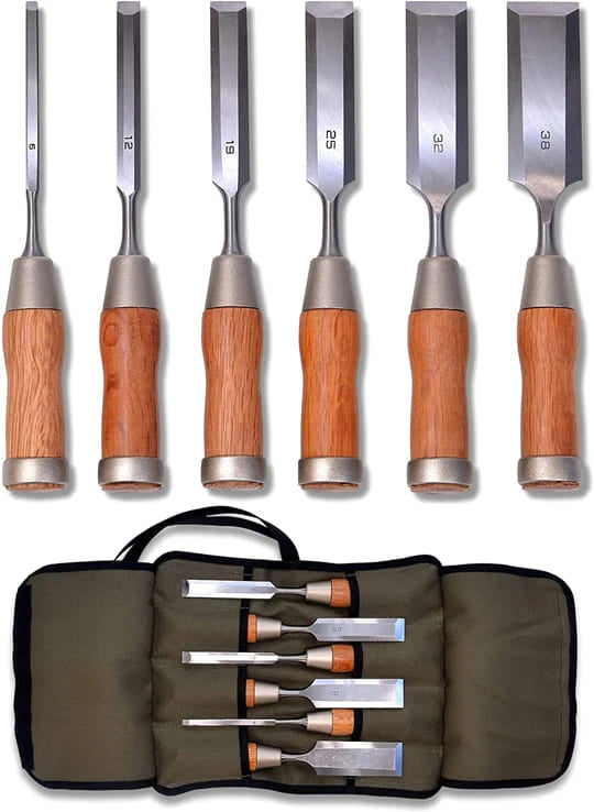 Зроблено в Японії / Лезо: Японська ванадієва сталь / Рукоятка: Японський червоний дуб / Ширина леза: 6 мм, 12 мм, 19 мм, 25 мм, 32 мм, 38 мм